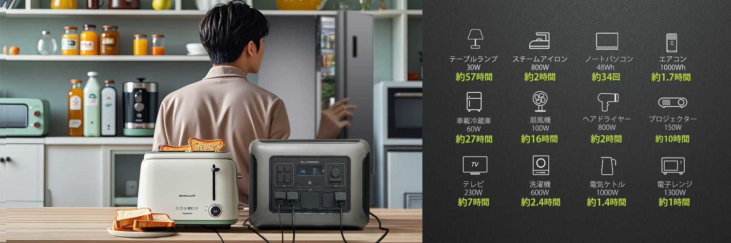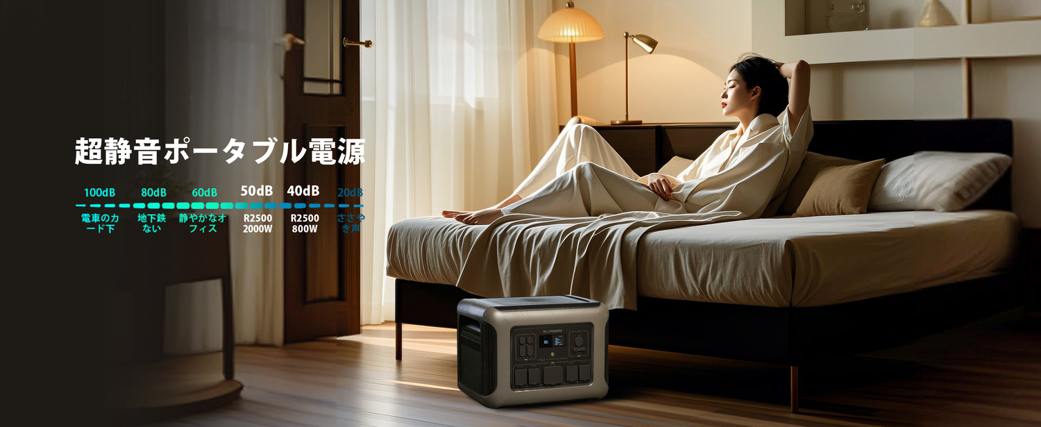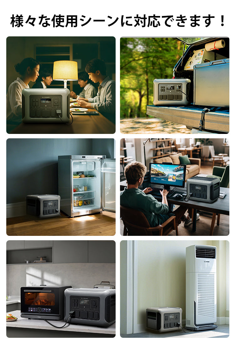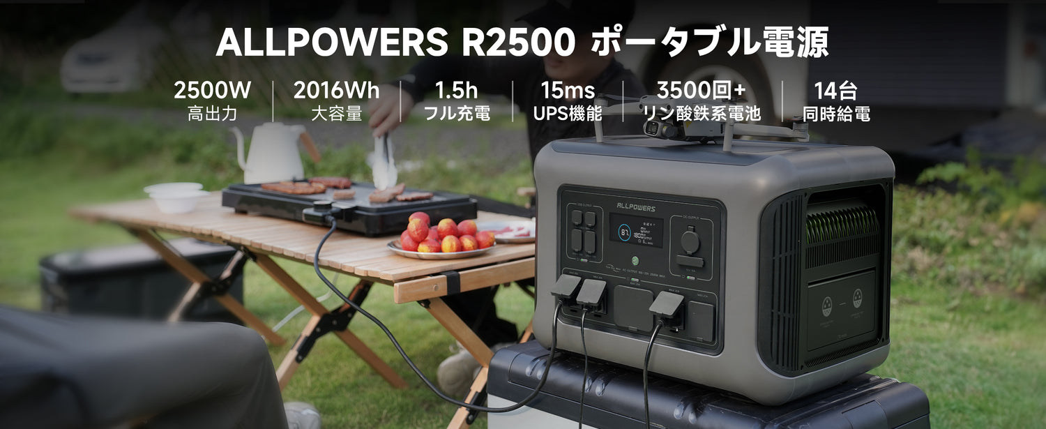 ALLPOWERS R2500ポータブル電源は2500Wの大出力で、出力は同容量の蓄電池より高く、日常では家族キャンプ、車中泊用のアウトドア電源としては容量たっぷりで、また地震災害などの停電時の非常用電源にも活躍しています。