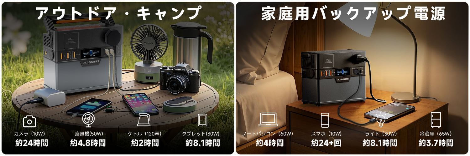 スマホ、タブレット、ドローン、懐中電灯、ノートパソコン、デジタルカメラ、サキュレーター、Nintendo Switch、液晶テレビ、プロジェクター、車載冷蔵庫、小型扇風機など、幅広い機器に電力を供給することが可能であり、この1台を使用することで、キャンプやワーケーションをどこでも行うことができます。