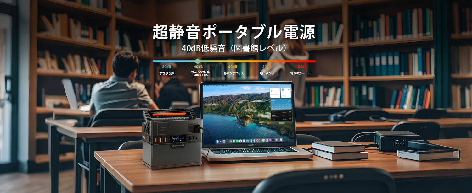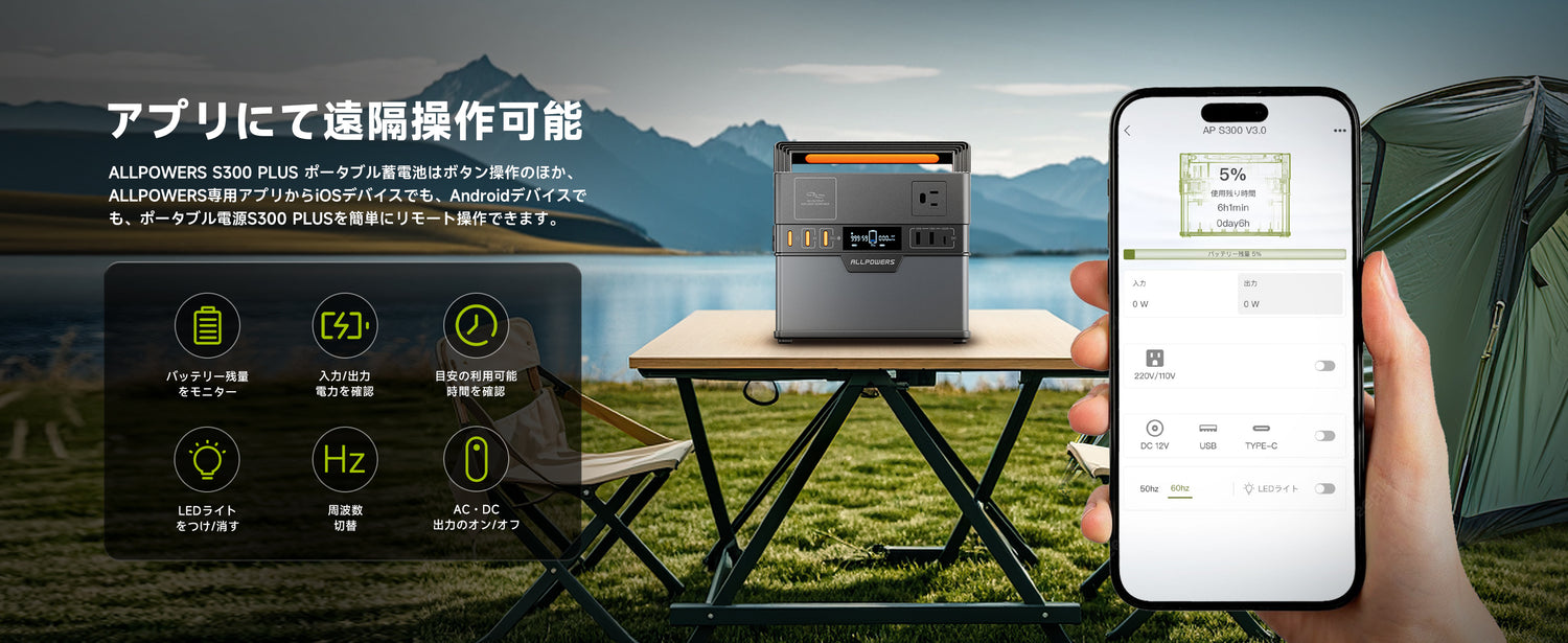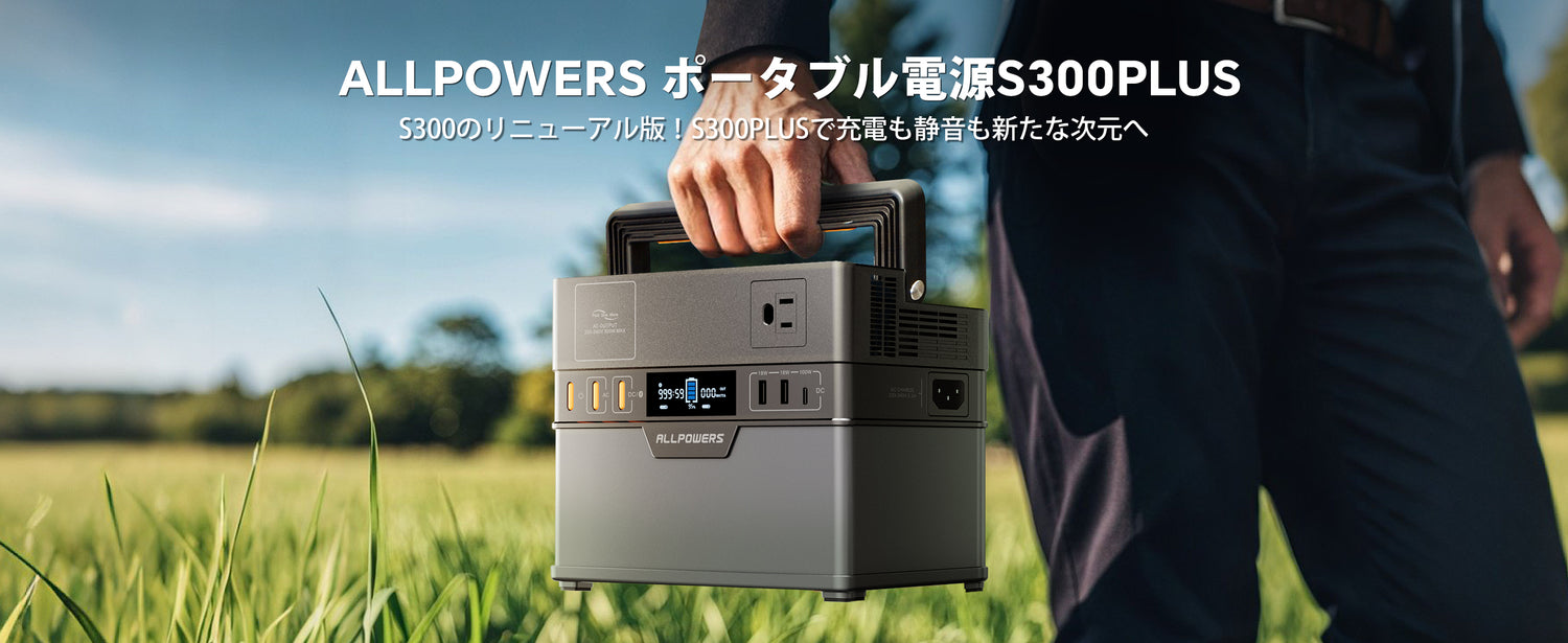ALLPOWERS S300 PLUS ポータブル電源は、288Wh/78000mAhの大容量リチウム蓄電池を搭載しており、最大出力300W(サージ600W)の純正弦波AC出力*1や100W急速充電が可能なUSB-Cポート*1、さらに2つのUSB-Aポート(最大18W)、シガーソケット(12V/10A)、ワイヤレス充電器(5V/1A)を備えています。